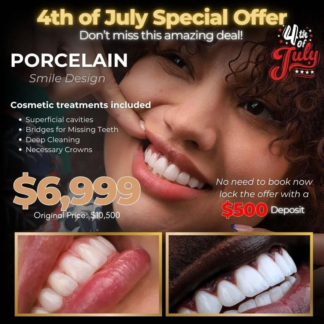 Our complete porcelain veneers package at $6,500 includes crowns, bridges, and any required treatments.